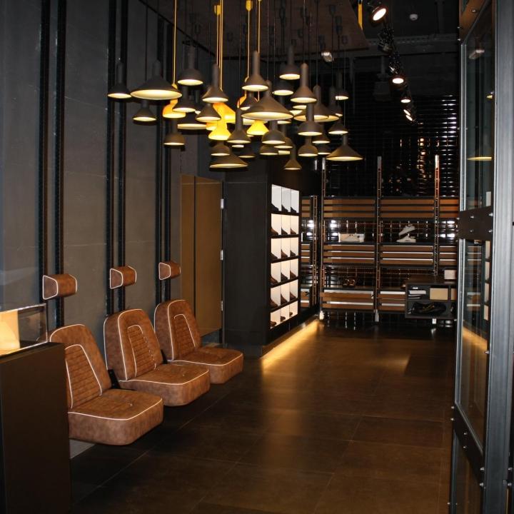 Nella stessa essenza abbiamo rivestito la parete principale dove è stato installato il gommone con il marchio del brand, sempre commissionato alla nostra azienda.